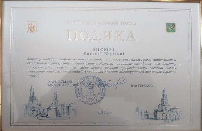 11 лютого 2026 року під патронатом Харківського міського голови Ігоря Терехова з нагоди Міжнародного дня жінок у науці відбувся захід «Жінки в науці 2026». Під час події було відзначено 48 жінок із понад 20 закладів вищої освіти Харкова. Наш університет представляли дві учасниці, одна з яких була представницею нашої кафедри – доцент, к.т.н. Місюра Є.Ю., яку нагороджено Подякою міського голови за багаторічну сумлінну й плідну працю, високий професіоналізм та вагомий внесок у розвиток наукового потенціалу України з нагоди Міжнародного дня жінок і дівчат у науці.